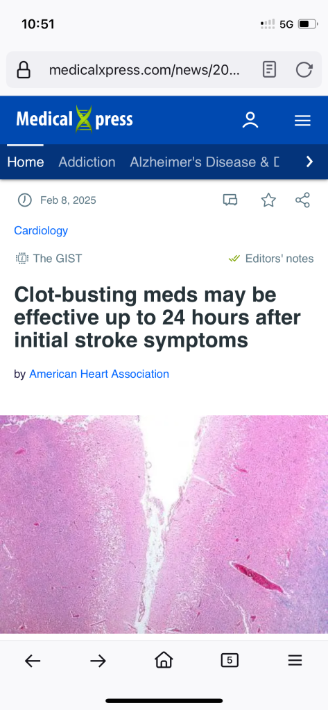 From a news article in medical Xpress, see the link below. A new medication helps victims of stroke recover better. It is a “clot buster” medication that can help up to 24 hours after a stroke.