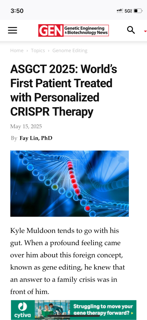 From an article in genetic and engineering news, a personally customized genetic treatment was made for an infant using the much talked about CRISSPER gene editing method.